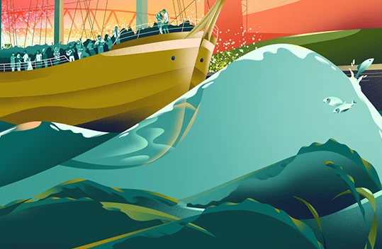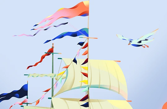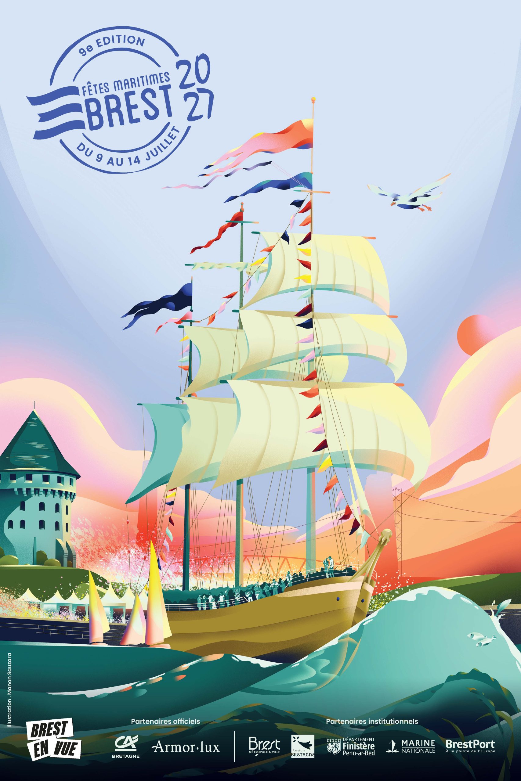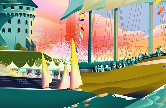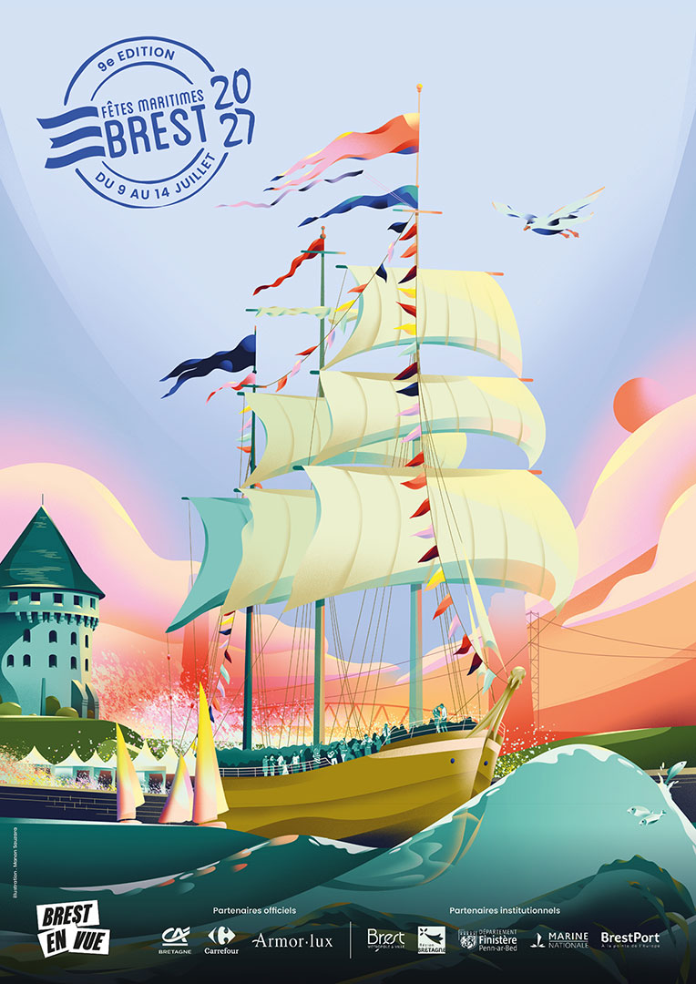 La composition mets en lumière un paysage entre terre et mer. Ici le navire majestueux à trois mats est au coeur de l’illustration tel une île festive. Le navire fend la mer en traversant de part et d’autres la terre Brestoise en fête qui s’érige et qui s’impose au même titre que cette mer d’Iroise.