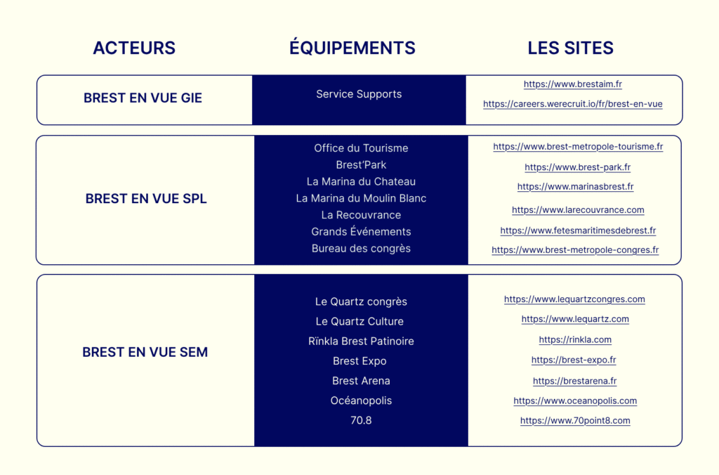 Le présent document décrit la manière dont vos données à caractère personnel sont collectées et traitées, conformément au Règlement UE 2016/679 (RGPD) et à la loi Informatique & Libertés modifiée, lorsque vous naviguez ou utilisez les services proposés sur l’ensemble des sites et domaines (ci-après « les Sites ») appartenant à la société de gestion privée Brest En Vue (ci-après « l’Entité »). L’entité regroupe plusieurs sociétés (SEM, SPL et GIE) ainsi que divers établissements. L’Entité est responsable de la gestion des principaux équipements de Brest Métropole.
